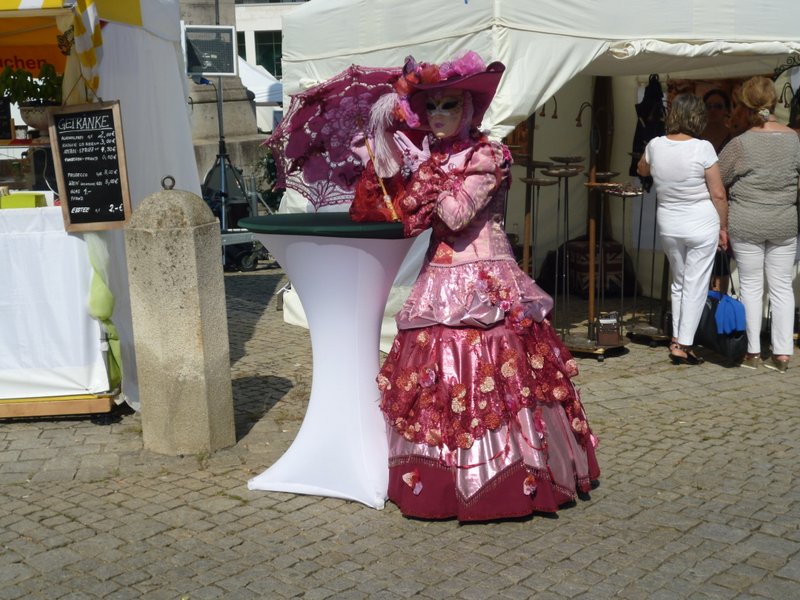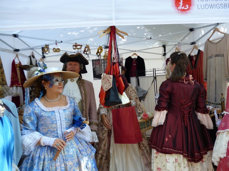 The group that went to Ludwigsburg saw a 19th century “Italian like” festival. Lots of the locals were dressed in crinolines, masks and finery and walked in the square for photo shots. It was really funny to see the people emerging from the train stations all dressed up in costumes and to walk through the Streets to the square where it was held. The activities were all in this square with blocked entrances (11 euros to enter). There were stalls to purchase goods, food, refreshments and then costumes, masks, hats, feathers – what a wonderful sight. Entertainers preformed in the street and on stages that had been erected here and there. There were tumblers, dancers, stilt walkers and a girl dancing on a huge red ball with a huge puppet in attendance.