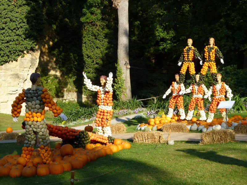 There was also a palace and gardens to visit at 8.50 euros to enter. We did not have time to go into the palace- only the gardens. It was like Versailles. Gardens were laid out beautifully – no waste land. There were pumpkins all over, barrel organ and monkey, elephant, rabbit in a hat, tumblers and horses. We sampled pumpkin ice cream with pumpkin seeds sprinkled on the top . Delicious !! In the evening everything was lit up in the square with stilt walkers dressed as illuminated moths performing to the sound of a lady singing opera. It was a beautiful sight. We had a meal and stayed to watch the fireworks before heading back to the hotel.