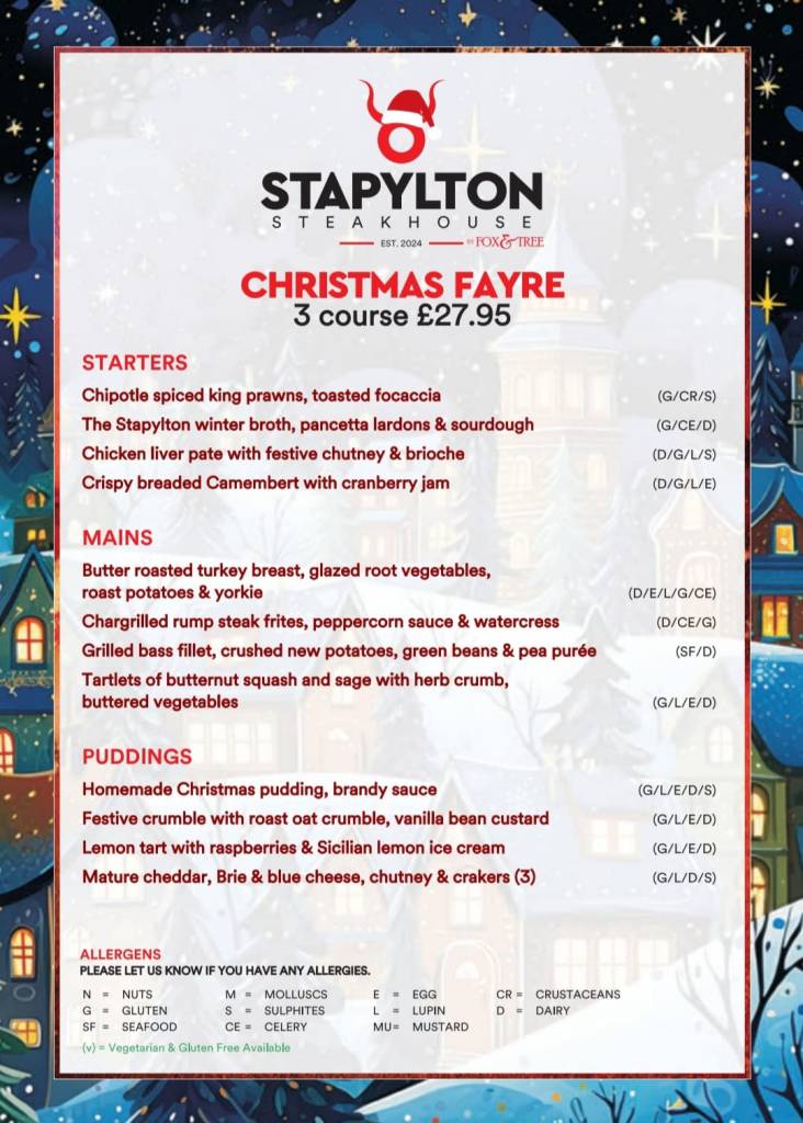 Staplton Arms Wednesday 27th November Christmas Fayre menu. 3 courses for £27.95.